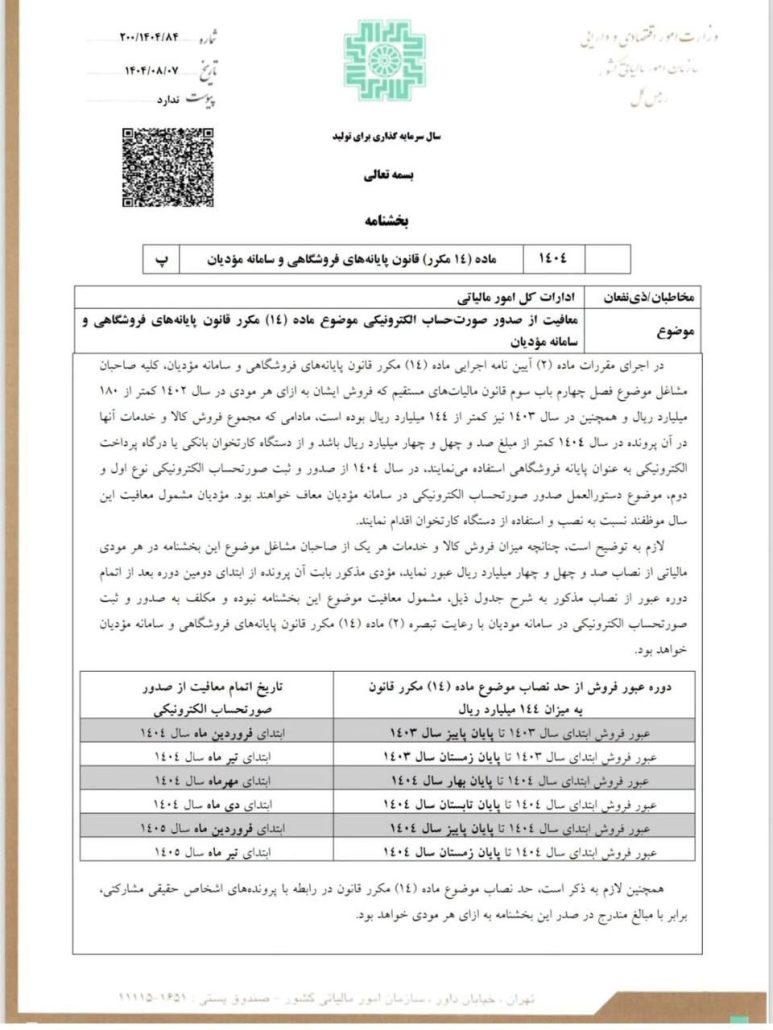 معافیت از صدور صورت حساب الکترونیکی موضوع ماده (۱۴) مکرر قانون پایانه های فروشگاهی و سامانه مؤدیان